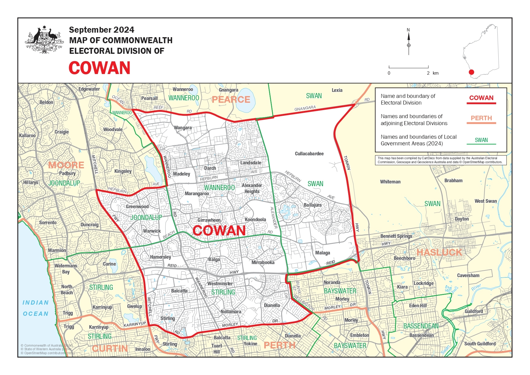 The Federal Division of Cowan takes in diverse, vibrant communities across Perth’s northern suburbs. It’s full of warm-hearted and welcoming people who work hard, look out for each other, and pursue a better future for themselves and their loved ones. It is an area of Perth defined by its friendly families, active local volunteers, and thriving community spirit.